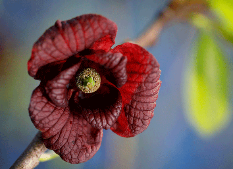 Pawpaw flowers generally bloom in April and May for two to three weeks. The blooms can be light green to dark maroon. The flowers emit a “yeasty, fermenting fruit-like scent, mimicking rotting fruit, the decomposition of carcasses and even a putrid odor” and the dark-colored petals tend to attract carrion-loving insects such as beetles and flies.