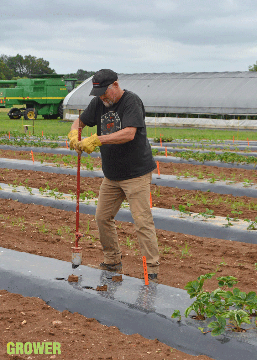 John Rost prepares holes for strawberry plants for a Neopestalotiopsis disease resistance trial at the Southeast Agricultural Research & Extension Center in Lancaster County, PA. Photo by Sally Colby